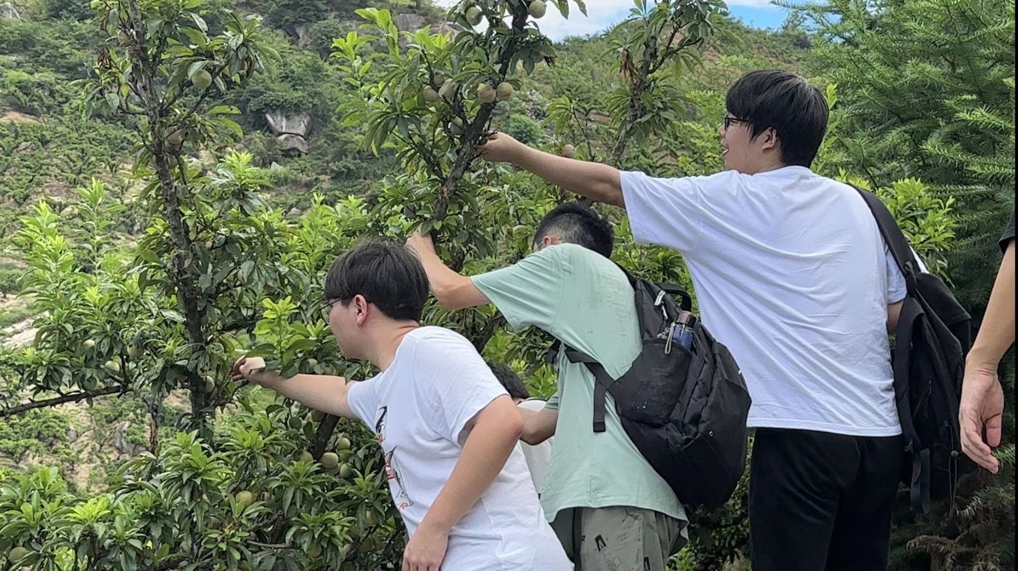 小队成员上山帮助当地的农民摘桃形李,了解农民的艰辛与不易 。同时进行直播带货,吸引大家前来购买,帮助农民增加了一定的销量。