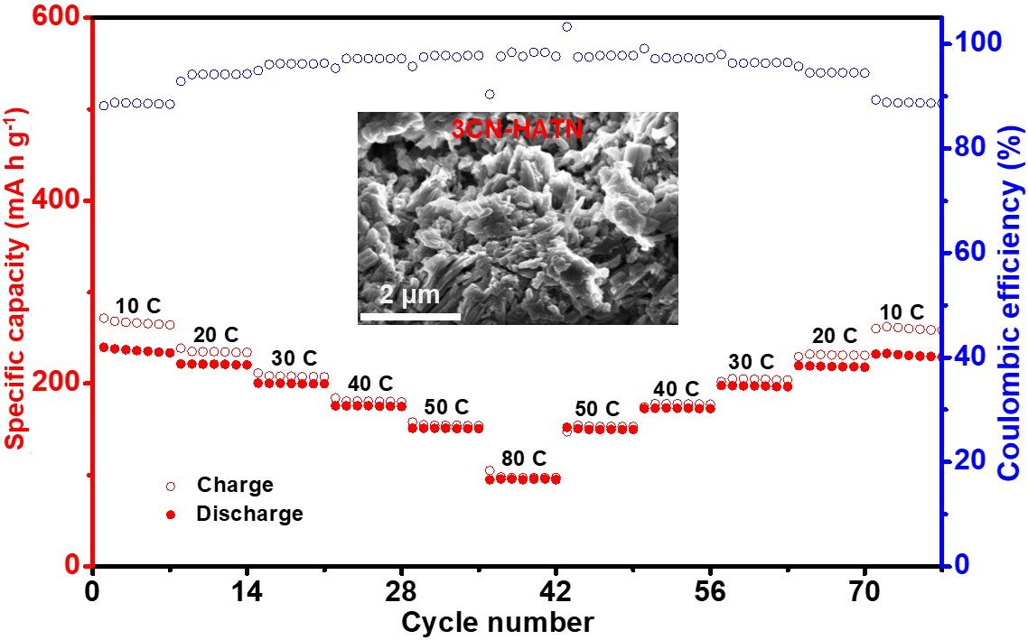 图2 3CN-HATN的SEM图及3CN-HATN//Ni(OH)2水系钾离子电池的倍率性能