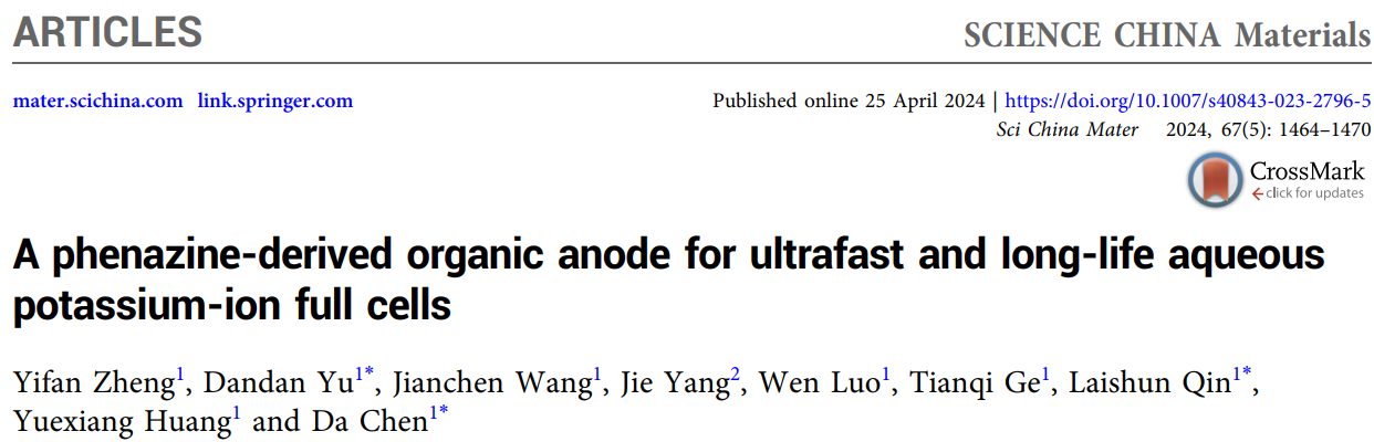 近日,我校材料与化学学院陈达教授和秦来顺教授联合团队在钾离子电池研究方面取得新进展。关于水系钾离子电池成果于2024年4月以“A phenazine-derived organic anode for ultrafast and long-life aqueous potassium-ion full cells”为题发表在国际学术期刊SCIENCE CHINA Materials(IF 8.1,中科院2区)上。第一作者为我校材料与化学学院本科生郑易帆,通讯作者为青年教师于丹丹博士、陈达教授和秦来顺教授。