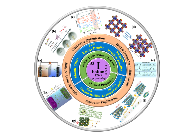 大力发展新能源是国家实现“碳达峰、碳中和”目标的关键战略。研究开发高安全,低成本水系储能电池对于实现新能源电源大规模并网应用具有重要意义。碘元素不仅与人类健康息息相关,而且还具有良好的氧化还原活性(I0/I-, ~0.54 V vs. SHE,211 mAh g-1)。碘的氧化还原电位适中,理论比容量高,转化反应动力学快,因此基于碘转化化学的水系电池备受关注。碘元素有7个价电子[Kr]4d105s25p5,具有不同的价态(-1, 0,+1, +3, +5, +7),因而可以实现多电子转移I+/I0 (0.99 V vs. SHE)和IO3-/I0 (1.15 V vs. AgCl/Ag),这可以进一步提高电池的能量密度。然而,水系碘电池的大规模应用仍然面临着一些棘手的问题,如活性物质碘的热稳定性差,导电率低以及多碘化物的穿梭效应等,亟待科研工作者继续攻坚克难。综述从碘的物理特性和碘转化化学两方面系统介绍了水系碘电池面临的挑战,并从正极宿主材料的设计,电解液优化,隔膜工程,负极材料的选择四个部分详细介绍了对应的解决策略,最后从水系碘电池的先进宿主材料的研究,原位表征手段和关键实验参数等三个方向进行了展望。