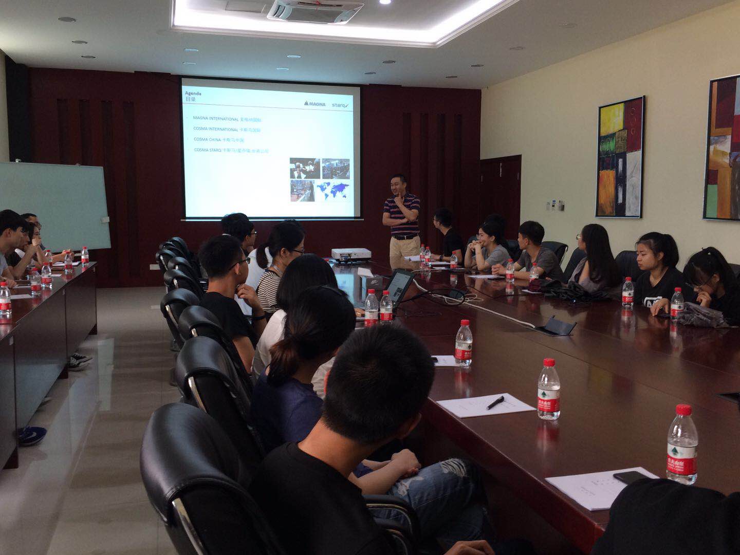 卡斯马星乔瑞汽车系统(杭州)有限公司副总经理Peter,人力资源经理许婉宁对来访师生表示热烈欢迎。Peter向同学们详细介绍公司的发展历程、主要产品、企业文化、用人要求和工作环境,并同每一位同学进行了互动交流。许婉宁对公司员工福利待遇进行大致介绍,并表示欢迎有兴趣的同学来公司实习,提问环节在同学们的热烈掌声中结束。随后,人事专员张琪乐及刘云带领学生参观了公司生产线,介绍了生产流程及产品概况。同学们认真观摩,积极提问,公司人员对同学们的问题进行了详细解答。活动点燃了学生暑期实习实践的热情,经过沟通交流,共有8名学生同公司达成了暑期实习意向。