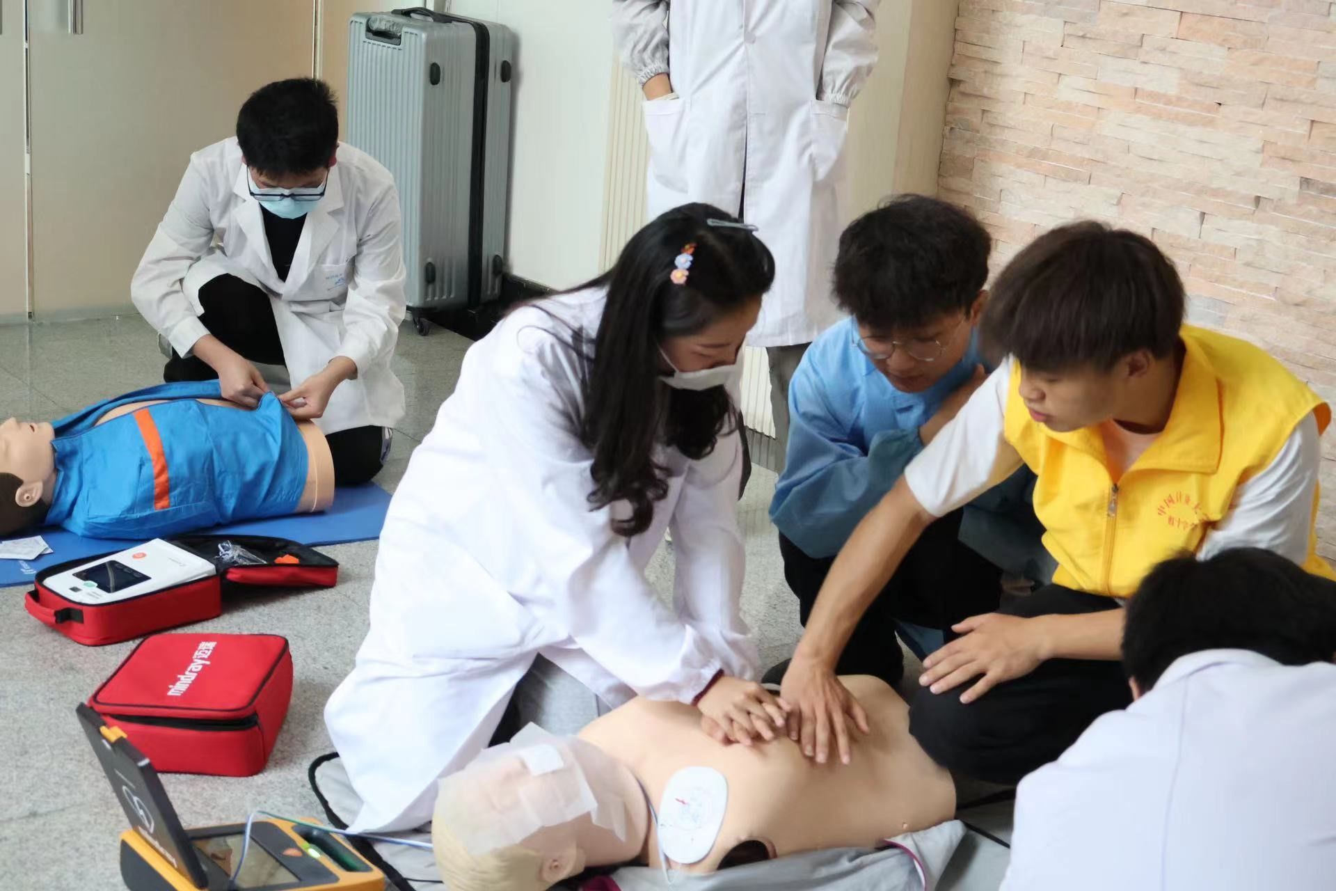 当天下午,校医院健康教育老师通过“理论讲授+现场演示+实践操作”的形式,讲解了实验室内造成的烧伤、玻璃扎伤等伤口处理包扎方法,急救箱内常用物品的使用等基本急救知识,以及心肺复苏的基本流程和步骤,包括判断是否丧失意识、有无自主呼吸、有无脉搏、胸外按压、清理口腔异物、开放气道、人工呼吸等。讲解过后,现场还进行了实操练习,陈老师和助教利用人体模型模拟突发心跳呼吸骤停,详细演示心脏按压、人工呼吸、AED自动除颤仪操作等,手把手教学、纠正同学们不规范的动作,参训同学积极学习,快速、准确地掌握了相应技术。