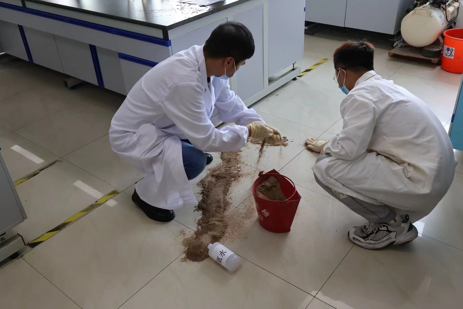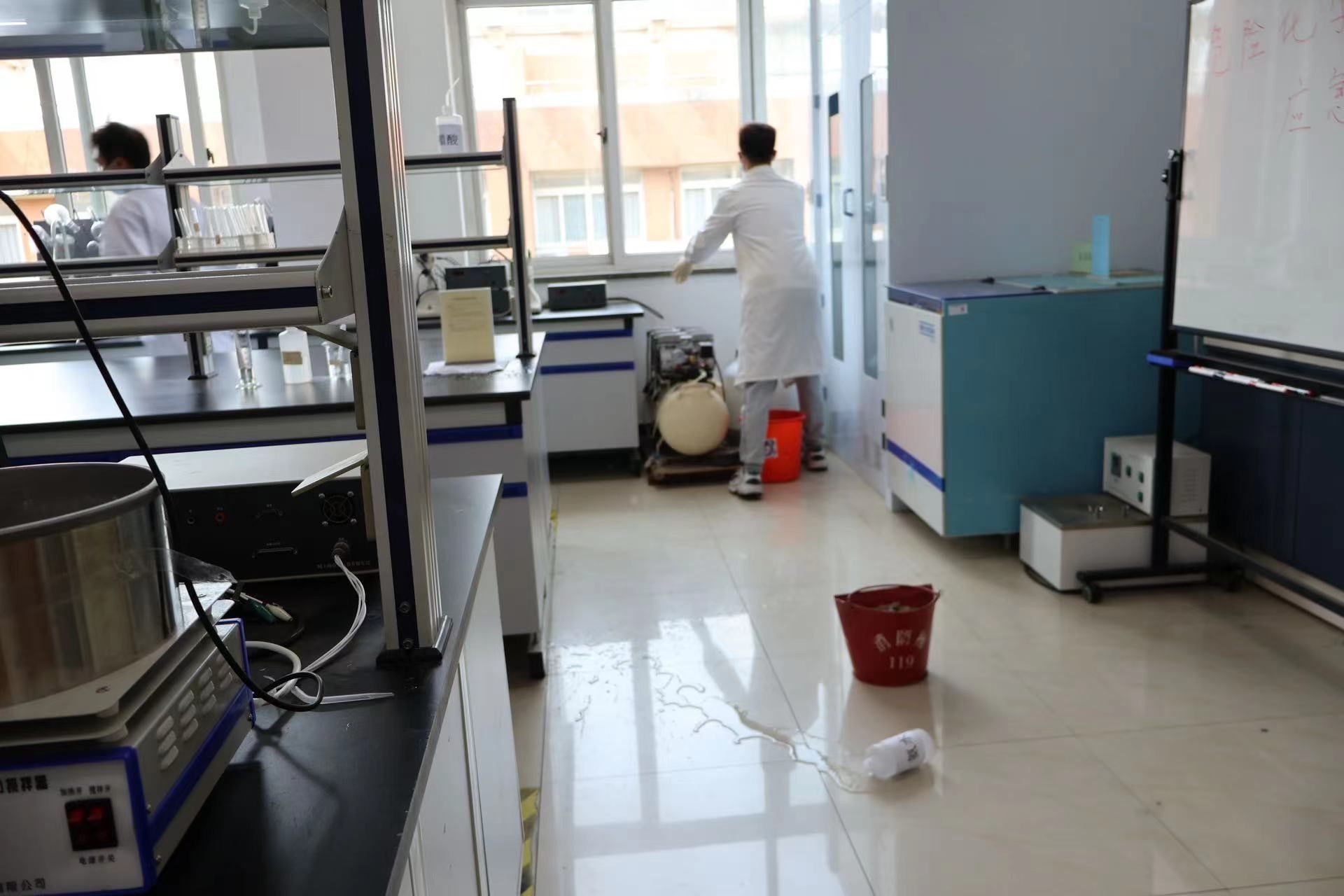 6月9日下午,材化学院现场指挥宣布化学品泄漏事故应急演练开展:一名研究生在实验操作时,不慎将一瓶氨水打翻在地,操作人员立刻大声呼喊告知氨水洒落,现场指导老师指挥实验室其他工作立即安全停止实验,人员有序撤离出实验室,确认泄漏范围和性质后,立即通报告知学院领导和安全员泄漏时间、地点、化学品名称、事故性质、危险程度等情况,并电话通知校医务室。安全员做好警示标志,打开门窗和通风设施,使用黄沙对泄漏源进行围堵,避免扩散。同时。现场救护小组将“受伤”人员带至水龙头和洗眼喷淋处,对受伤皮肤进行冲洗,待医生到场做进一步救治。操作人员穿好防护装置使用醋酸进行中和后完成清理,污染物放置于废弃物专用容器中,清理完毕后通知撤离人员返回。化学品泄漏演练顺利结束。