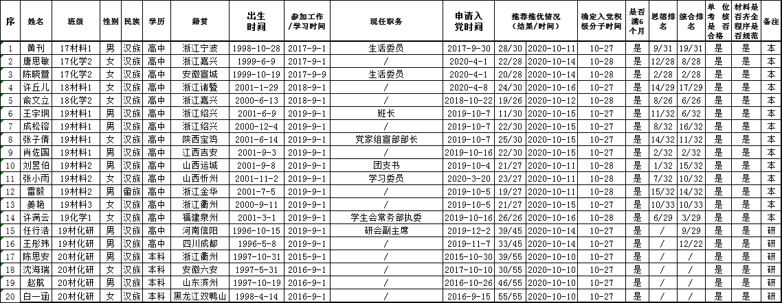经支部大会讨论研究,同意沈天成等20位同志列为入党积极分子进行培养和教育,现将其有关情况予以公示。在公示期限内,欢迎广大党内外群众来信(署名)、来电或来访反映问题。公示时间为2020年11月9日至2020年11月14日。