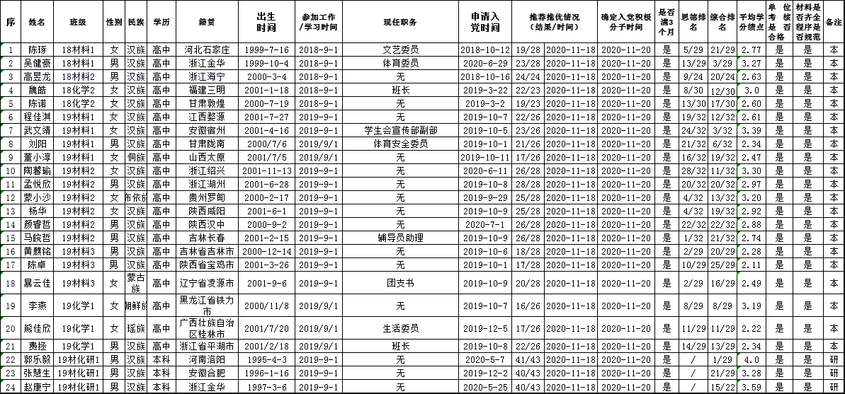 经支部大会讨论研究,同意陈琢等24位同志列为入党积极分子进行培养和教育,现将其有关情况予以公示。在公示期限内,欢迎广大党内外群众来信(署名)、来电或来访反映问题。公示时间为2020年11月25日至2020年11月30日。