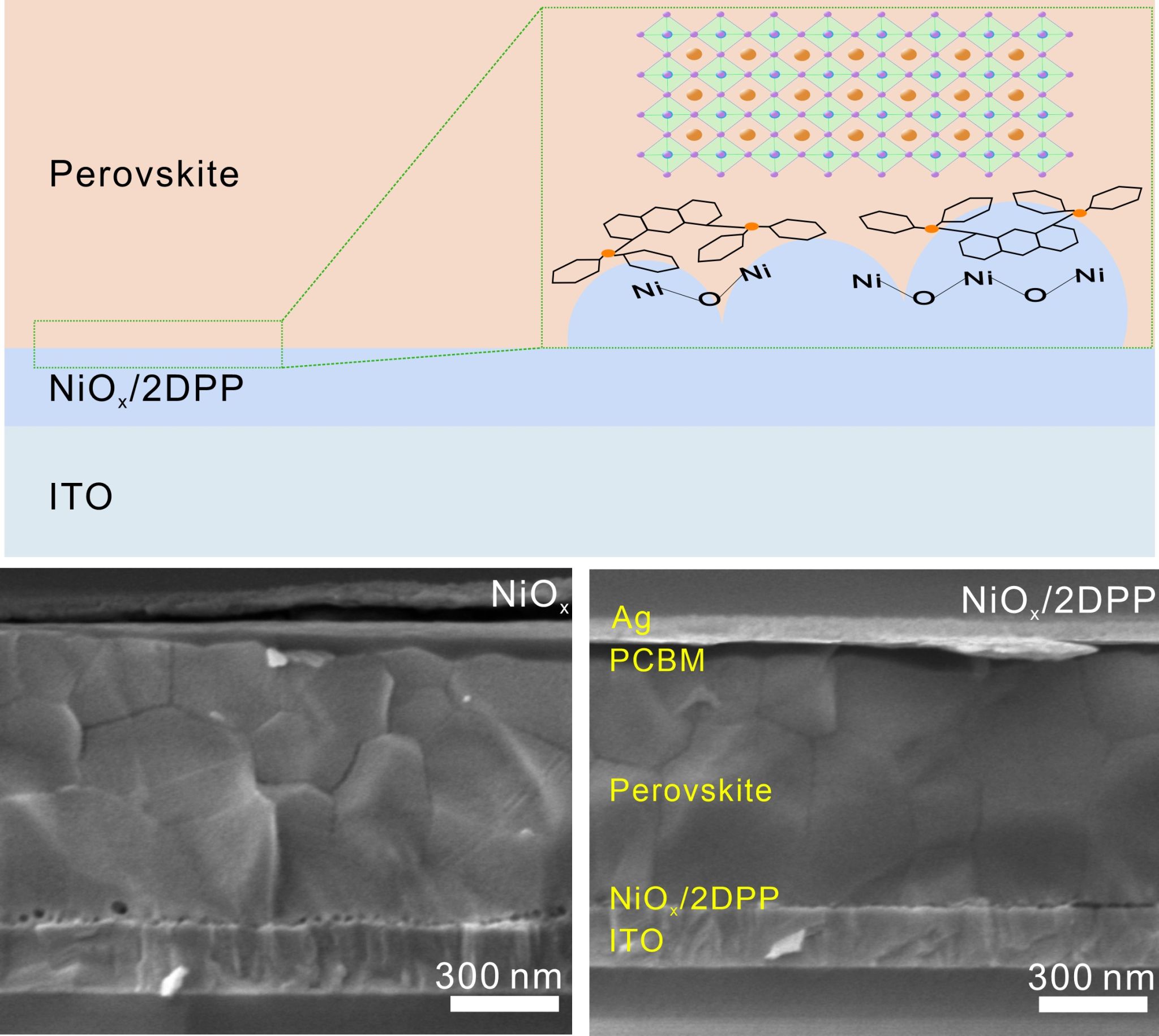 该论文提出了一种界面修饰策略,通过开发双齿配体4,6-二(二苯基膦)吩嗪(2DPP)以解决NiOx/钙钛矿的界面接触的问题。2DPP分子不仅可以调节NiOx的能量排列,还可以减少钙钛矿埋藏界面上的纳米孔洞。2DPP分子锚定在NiOx薄膜上,与NiOx和钙钛矿形成牢固的双齿键,有效地增强了电荷的提取和转移,减少了非辐射复合。因此,基于2DPP改性的PSCs的PCE达到了21.9%,并且在RH为30-40%的空气中放置1000小时保持其初始PCE的75%以上。
